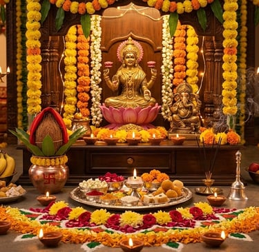 Flowers & Garlands: Fresh marigolds and lotus flowers (Goddess Lakshmi’s favorite).
